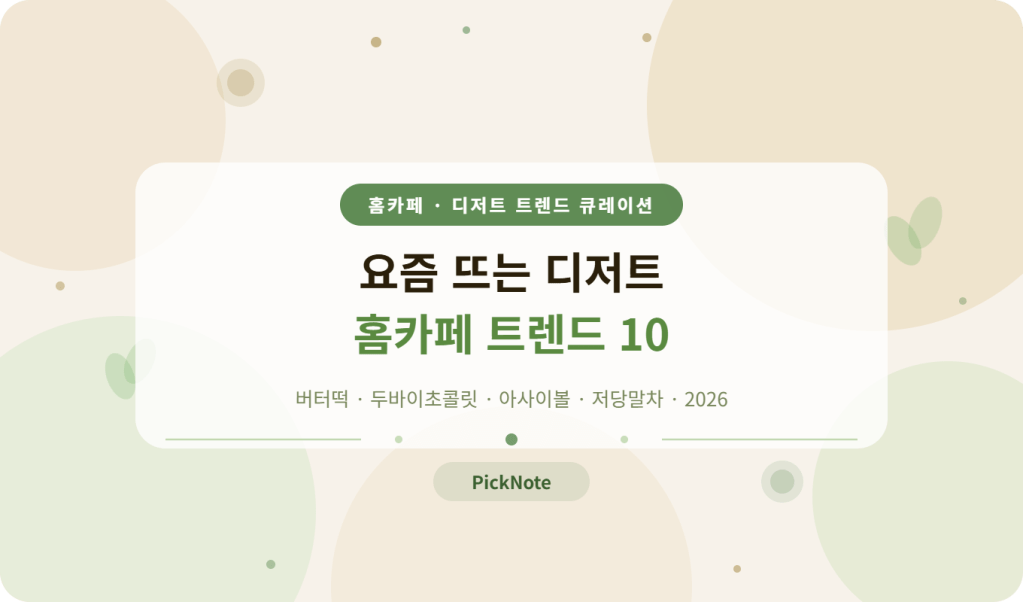요즘 많이 보이는 디저트·홈카페·가벼운 식사 대용 키워드만 골라 한 번에 정리했습니다. 버터떡, 두바이 초콜릿, 그릭요거트, 아사이볼, 냉동과일, 저당 말차, 프로틴 음료처럼 지금 자주 보이는 흐름 위주로 담았습니다.